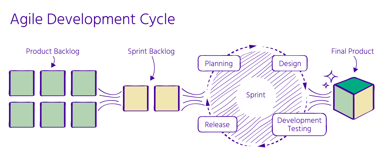 Het [Agile ontwikkelingsproces](https://www.ariadgroup.com/en/blog/all-about-scrum-Agile/details-about-scrum-Agile-components) omvat verschillende sleutelpraktijken. Ten eerste is er de "product backlog," die een lijst is van gewenste functies en taken voor het hele jaar. Vervolgens heb je voor elke maand een "sprint backlog," die een lijst is van dingen om aan te werken tijdens die maand. De Agile cyclus vindt regelmatig plaats, meestal elke twee weken of een maand, zoals beslist door het team, en het omvat stappen zoals plannen, ontwerpen, ontwikkelen, testen en het vrijgeven van de software. Deze cyclus blijft zich herhalen, waarbij elke sprint put uit de sprint backlog, en het leidt tot de levering van het eindproduct.