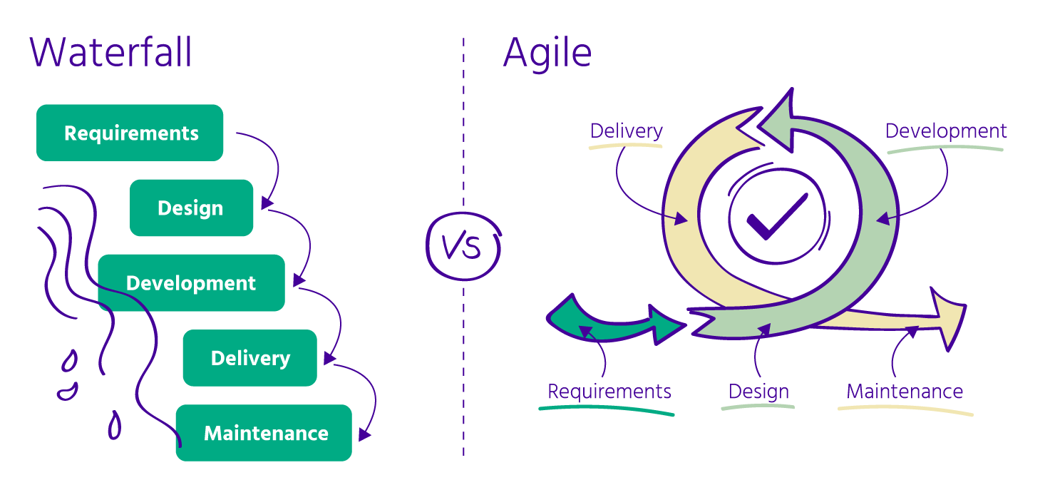 In de traditionele "waterval" aanpak kon het voltooien van een softwareproject een heel jaar duren zonder enige inbreng van de klant. Echter, met de Agile-aanpak wordt diezelfde software elke maand of tijdens een "sprint" aan de klant geleverd, waardoor vroege feedback en geleidelijke verbeteringen mogelijk zijn. Op deze manier heb je aan het einde van het jaar een succesvolle eindoplossing.
