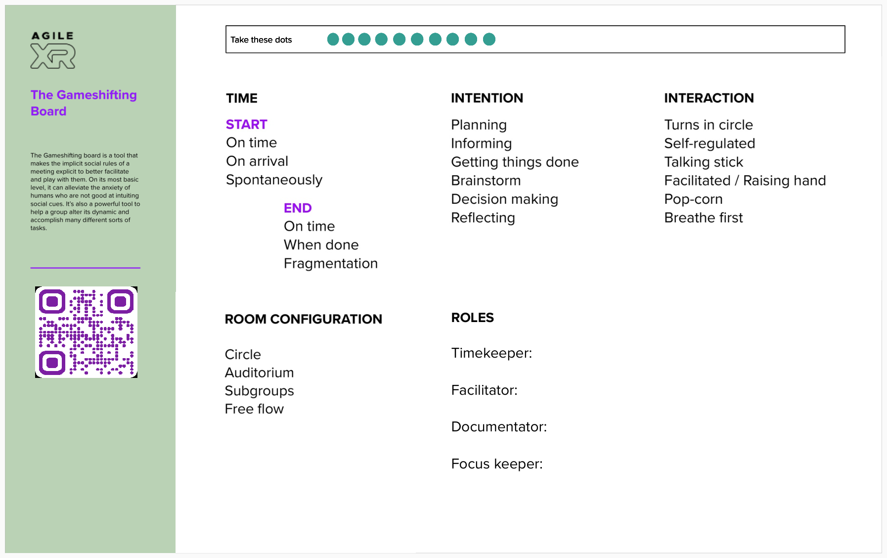 Hieronder vind je een voorbeeld van het gameshifting-bord dat is ontworpen onder het AgileXR Erasmus+ project. Vanaf dat bord kun je elke keer de voorwaarden van de dagelijkse vergadering kiezen.