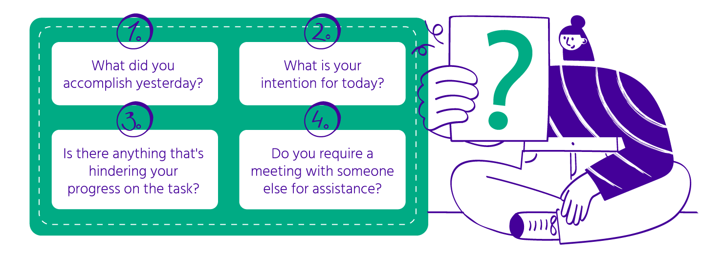 Als je voor een dagelijkse vergadering kiest, verzamel je je studenten 's ochtends ongeveer 15 minuten rond het Kanban-bord. Tijdens deze korte bijeenkomst zou elke student een set vragen moeten beantwoorden in ongeveer een minuut of twee. Het primaire doel van de dagelijkse vergadering is om een bondige en informatieve update te geven, intenties vast te stellen, prestaties te delen en eventuele behoeften of obstakels aan te pakken. Hier zijn de vragen voor de Stand-up vergadering: