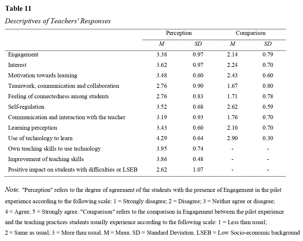 De pilot onderwijsactiviteit werd door leraren geëvalueerd via een enquête, met de focus op verschillende, door leraren waargenomen variabelen. Deze variabelen omvatten Betrokkenheid, Interesse, Motivatie voor Leren, Samenwerkingscommunicatie en -samenwerking, Gevoel van Verbinding tussen Studenten, Zelfregulatie, Communicatie en Interactie met de Leraar, Leerperceptie, Gebruik van Technologie om te Leren, Vaardigheden om Technologie te Gebruiken, Verbetering van Onderwijsvaardigheden, en Impact op Studenten met Moeilijkheden of een Lage Sociaal-economische Achtergrond (LSEB).