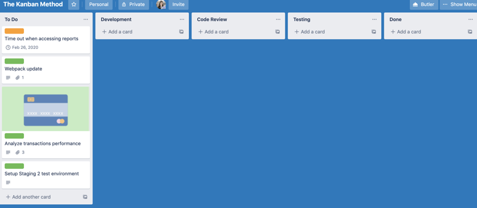 Een manier om Trello te gebruiken is om er een Kanban-bord in te creëren. Een Kanban-bord is een agile projectmanagementtool die ontworpen is om werk te visualiseren, werk in uitvoering te beperken en efficiëntie te maximaliseren. Dit wordt gedaan met behulp van drie kolommen, de lijsten die we in Trello kunnen maken. Deze zijn (1) taken om te doen, (2) taken in uitvoering, en (3) voltooide taken. We stellen voor om wat meer kolommen te maken om reflectie bij de student te stimuleren zodra de taken zijn voltooid, bijvoorbeeld: "Wat heb ik goed gedaan tijdens deze taak?" "Wat kan ik verbeteren?" "Hoe kan ik andere collega's helpen?